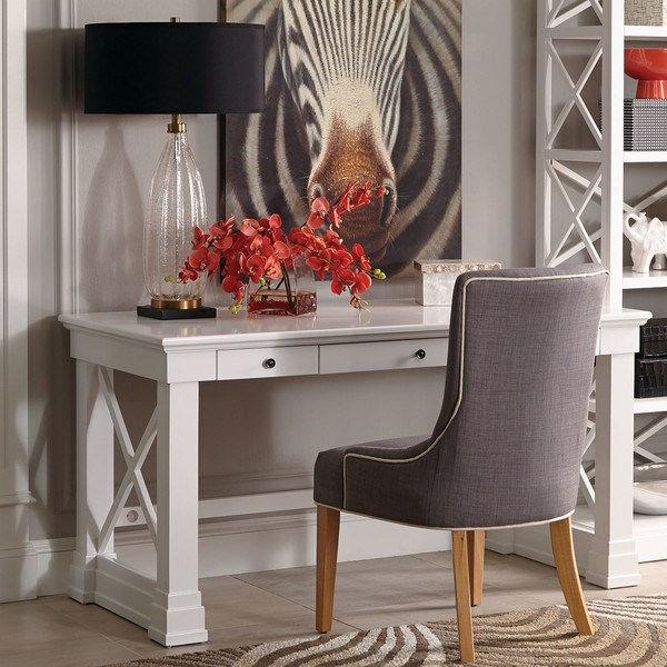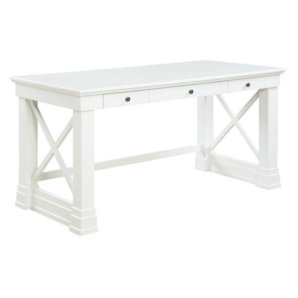 Create function with this desk finished in antique white. Featuring 3 drawers, X-Shaped Braces and a spacious top finished in antique white, this writing desk is beautiful as well as functional.