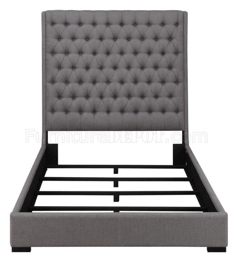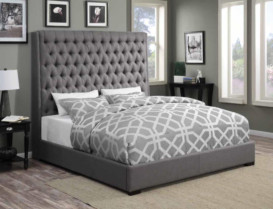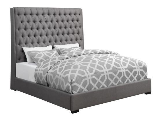 Tall headboard with button tufting. Solid wood legs finished in cappuccino.