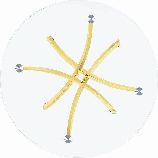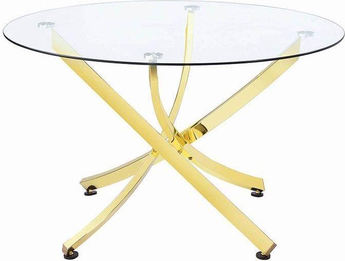Step out of the boring, old and ordinary with this cool and modern dining set. Crisscrossing brass legs pair with the tempered glass table top to fit into the upscale home. These edgy dining Chairs feature gravity-defying U shaped bases finished in brass. The leatherette upholstery adds texture and comfort. The leatherette upholstery is a dream come true when clean up comes around, simply wipe up spills with a wet cloth! Creating an upscale dining area in any sized room.