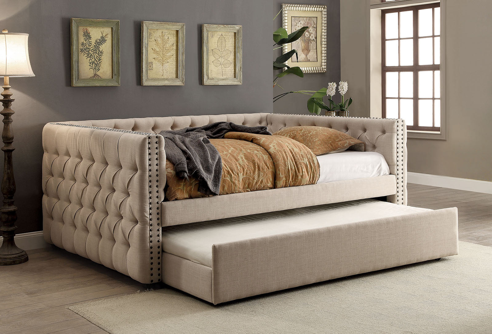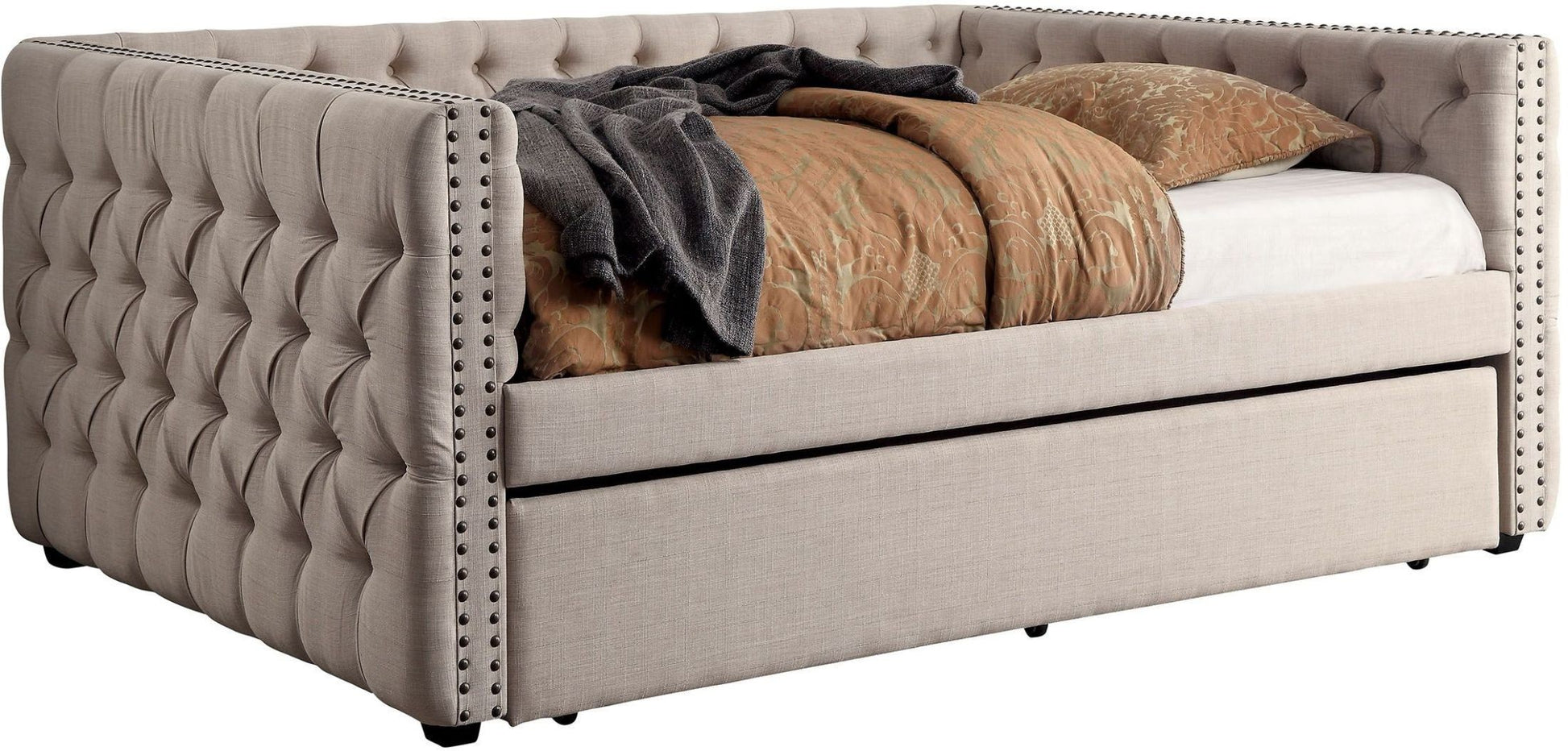 The soft, feminine touches displayed on this romantic ivory colored daybed provide a soothing appeal to any bedroom. Deep button tufting runs along the entire linen upholstery as dual nailhead trim enhances the tuxedo style structure. This daybed is sure to be a welcome addition to any home!