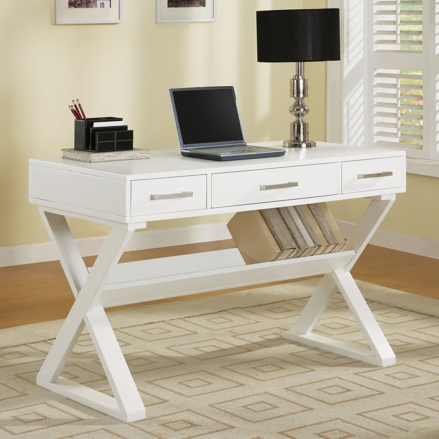 This cool contemporary desk will be a stylish addition to your home office, hallway, living room, or wherever you need a work space in your home. The generous top surface has smooth clean edges, offering plenty of space to spread out your paperwork, place or lamp, or organize office essentials. Three drawers below will keep the rest of your supplies organized and out of sight, for a calming work space where you can really get things done. Simple contemporary silver metal handles accent each drawer front. Crossing legs below create a bold look, with a shelf that is perfect for holding books.