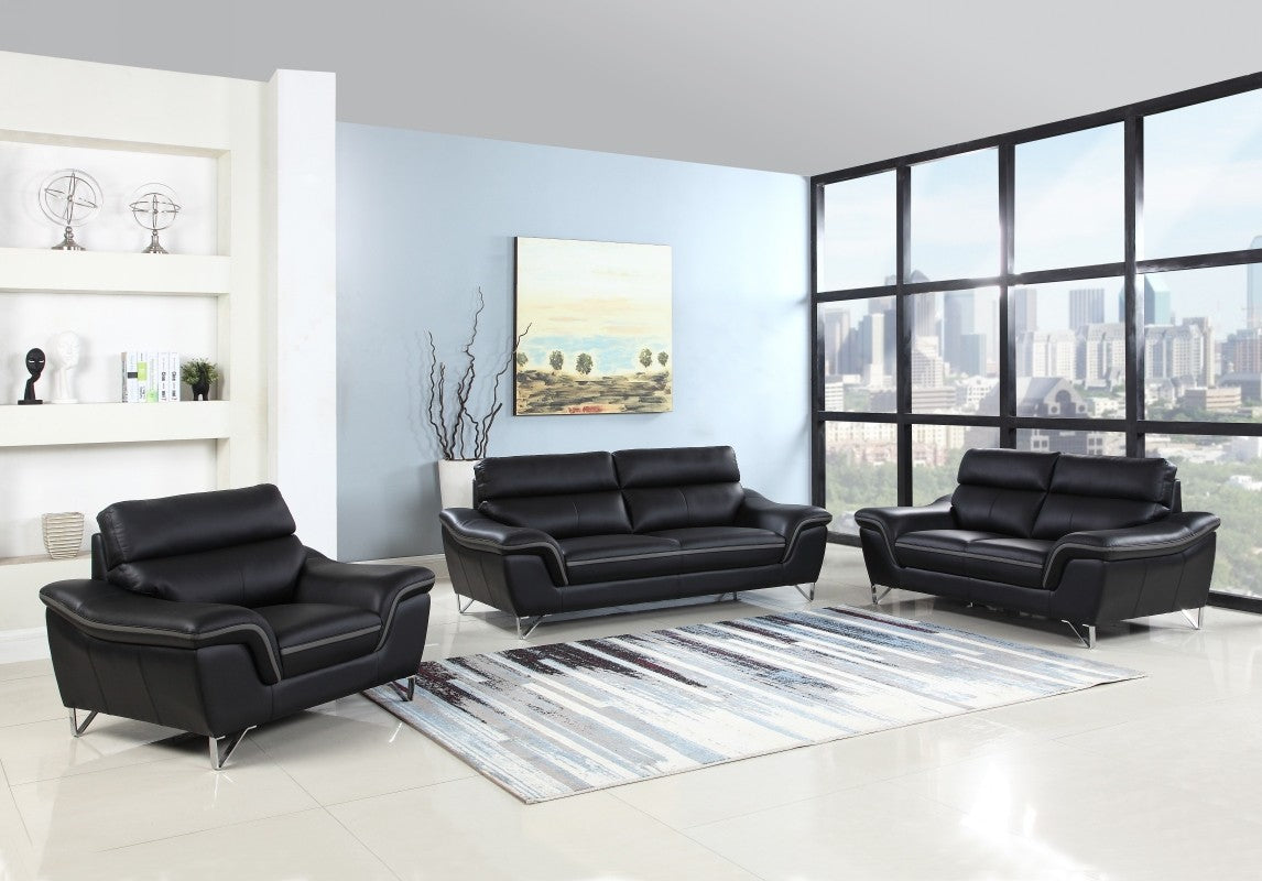 Enjoy modern style and top-notch relaxation with this Contemporary Black Premium Leather Match Sofa Set. The elegant design and exquisite cushioning provides perfect comfort that will keep you cozy and the extra padded arms add the perfect finishing touch. The Contemporary Black Premium Leather Match Sofa Set will transform your living room with it's modern design. With a slick Black Leather Match like cover, cushy double pub back, glitzy off chrome accent legs, this set seamlessly blends sexy with class, utterly transforming any decor.