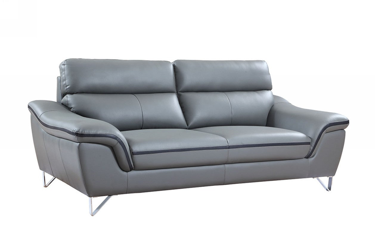 Enjoy modern style and top-notch relaxation with this Contemporary Gray with Black Accent Leather Match Sofa. The elegant design and exquisite cushioning provides perfect comfort that will keep you cozy and the extra padded arms add the perfect finishing touch. The Contemporary Gray with black accent Premium Leather Match Sofa Set will transform your living room with it's modern design. With a slick Gray with black accent Leather Match like cover, cushy double pub back, glitzy off chrome accent legs, this set seamlessly blends sexy with class, utterly transforming any decor.