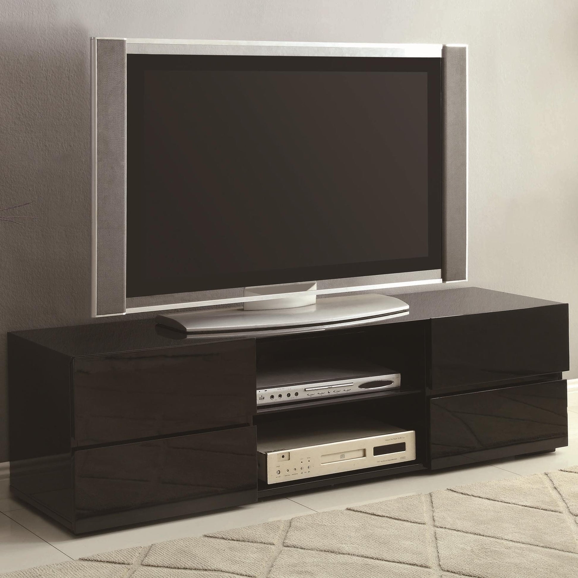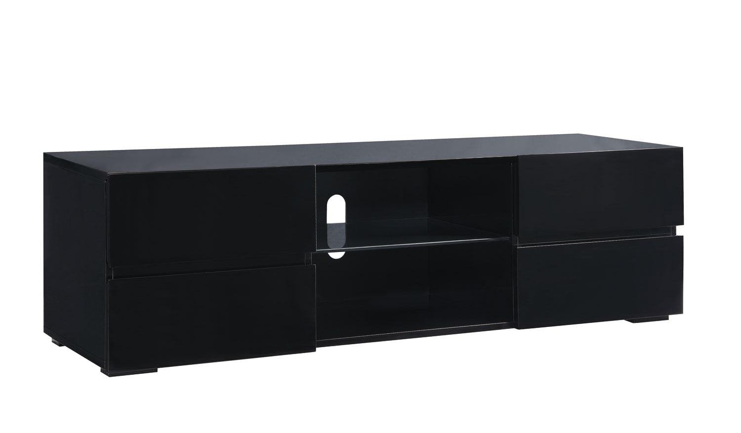 This TV stand versatility and contemporary style will blend masterfully in your living room area. Offers four storage drawers, a sturdy glass shelf in the center and wire management in the back.