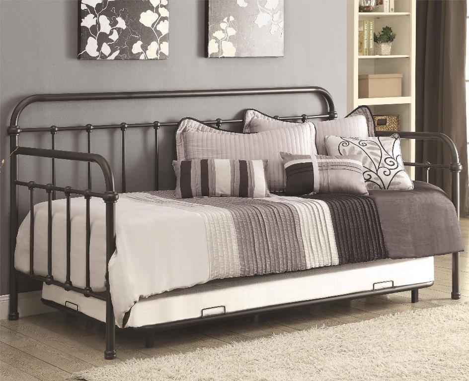 This bed has a black metal frame with a vertical line design. It also features a trundle below, where you can add another mattress, making it easy to have extra overnight guests stay over. This piece includes a linkspring, and holds up to 400 pounds. Mattress not included.