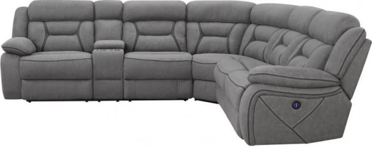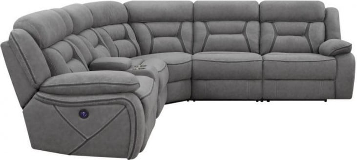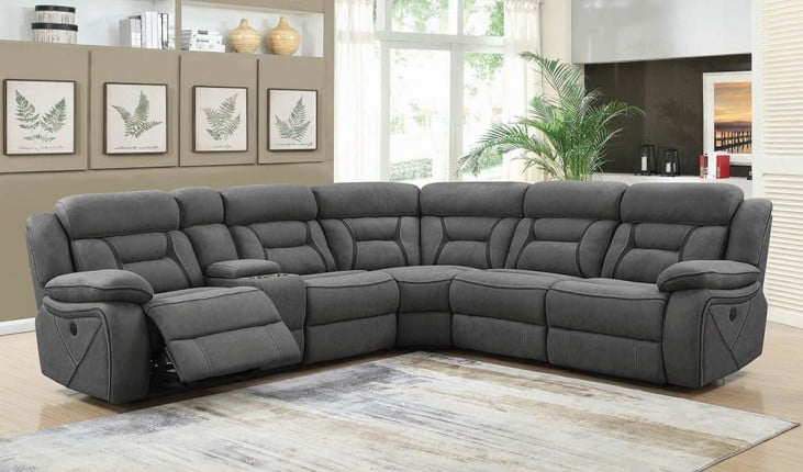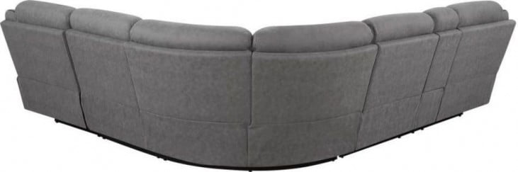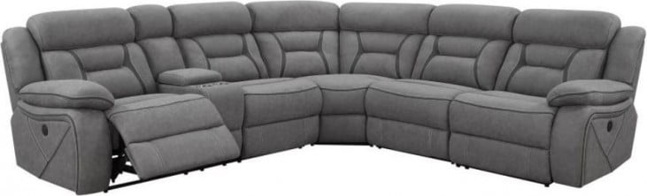 Perfect and affordable best describe this sectional. This collection is perfect for both apartment dwellers and those with more open space. The transitional sectional includes a spacious corner seat, dual power recliners love seat, armless chair and Right facing reclining chair. Keep your precious devices at arms reach and fully charged by storing everything in the convenient storage console. This collection makes an impressive statement with its beautiful tailoring, luxurious-soft faux sueder cover, and sound construction. You will not go wrong with buying this cozy sectional, "it will honestly be the most popular place to be" with all of its convenience and comfort.