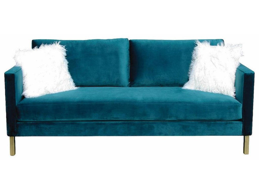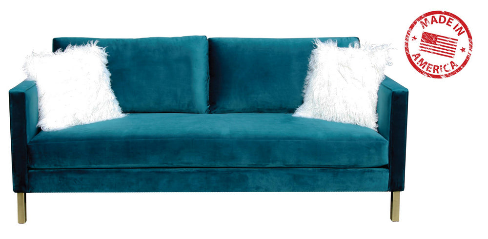 The Haley Sofa has an elegant style and comfortable support. The gold legs provide a cool and modern twist. This Collection is manufactured here in the USA. Our custom sofas are unique for the simple fact that they are made from solid amber wood and are hand crafted with your comfort in mind. Choose from a variety of quality fabrics. Made to order items generally ship in 2-3 weeks.