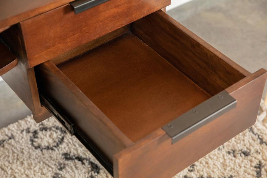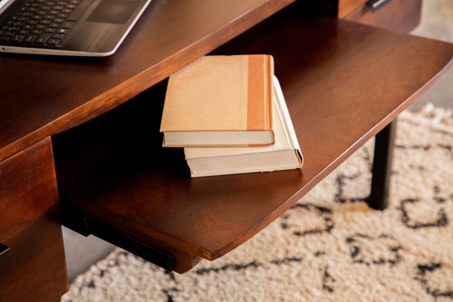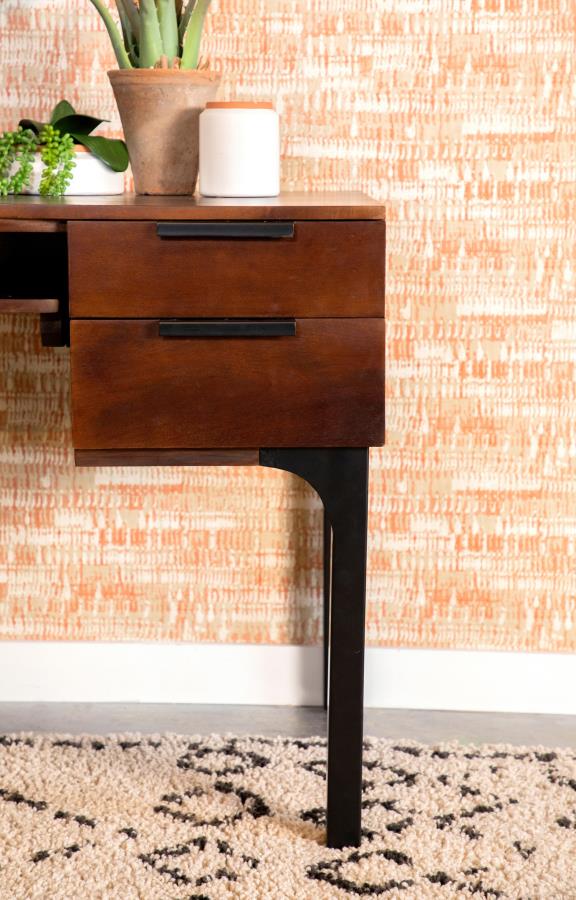 This writing desk provides efficiency and style! A spacious tabletop has plenty of room for a laptop and notebook. This desk also provides extra storage featuring, four drawers with black bar pulls and a center shelf. Made from mango wood, this brown writing desk is supported on black heavy gauge steel legs.