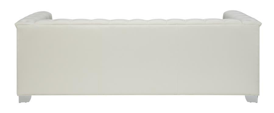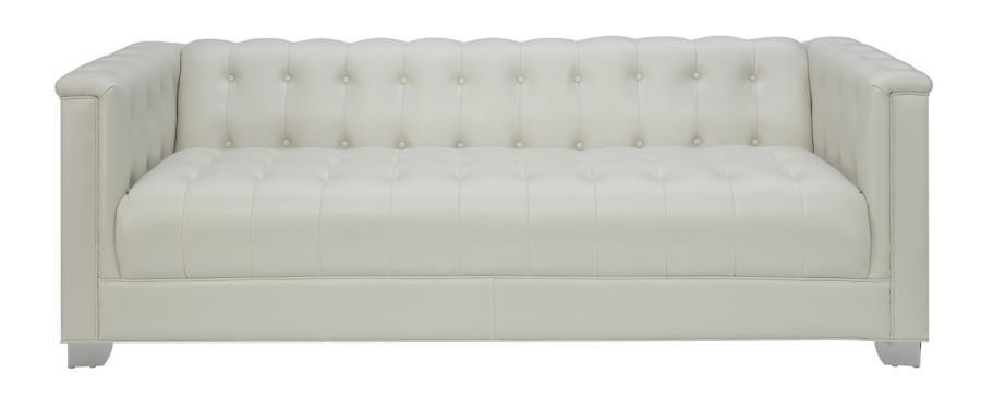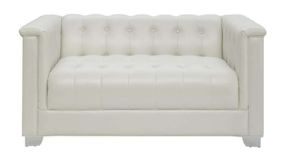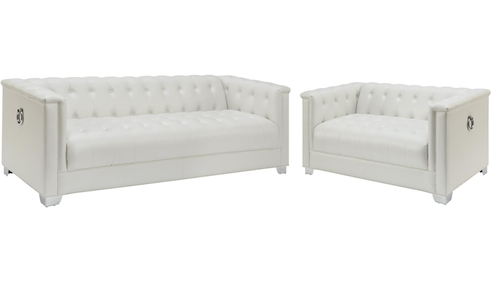 This attractive pearl white leatherette collection will complete your upscale area. The design of this sofa allows it to adapt in a multitude of environments with its tufted cushions back and seat serve as the initial focal point of the collection, heavy duty chrome doorknocker handles and chrome legs solidifying the look.