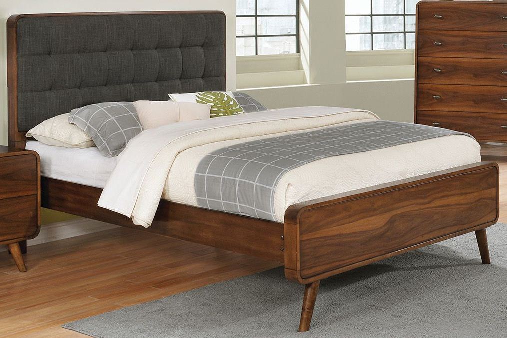 A Danish modern motif with the simple elegance of this dark walnut platform bed. A nicely padded headboard shows off rich faux leather upholstery and enhances the natural woodgrain effect of its charming mid-century design.