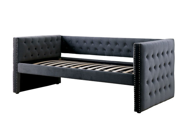 The rigidity of the tuxedo design offers an alluring base for a daybed. A softer button tufting encases the entirety of this piece, from outside arms to back rest, highlighted by a twin nailhead trim running along the length of the frame. Combine with some throw pillows to add depth and extra comfort. Should the need arise for extra bedding; a pull out trundle can accommodate your needs.