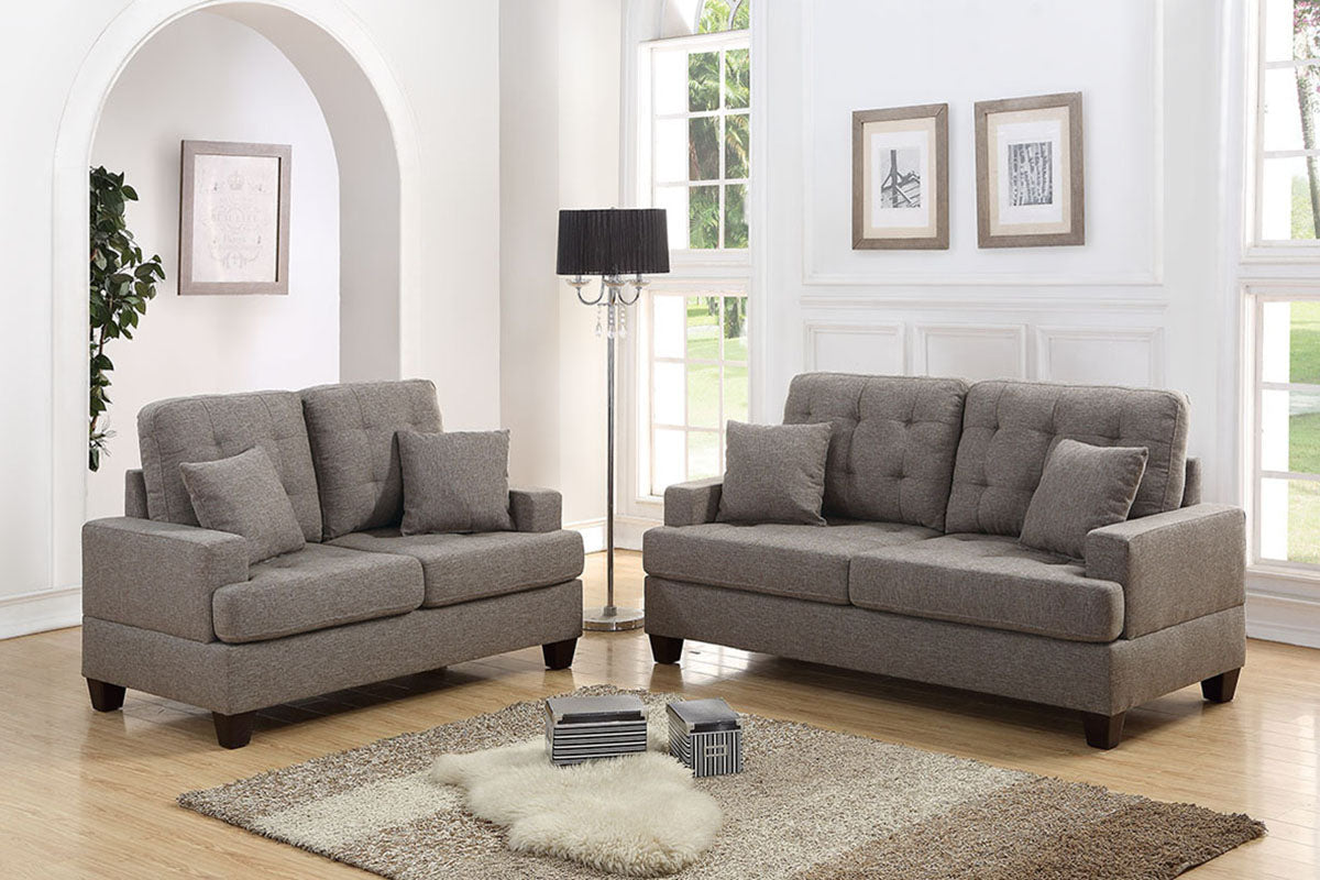 Delight in this 2-piece sofa set featuring plush pillow seat and back cushions topped with accent tufting. This square structure includes vibrant select hues in a linen-like fabric for a casual look. Available in coffee, blue or citrus.