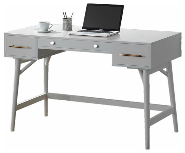 Angled round and tapered legs give this desk a simple mid-century modern appeal. With three drawers for storage and a spacious desk top, this desk is a stylish and functional addition to your home office space.